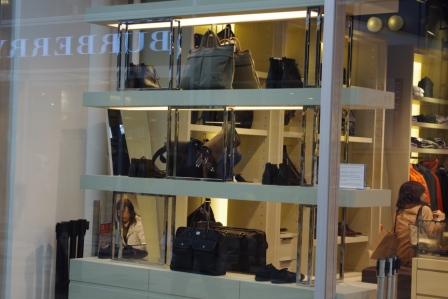 「バーバリー」の店舗を入ると正面には、インポート物のバッグやマフラーなど、
